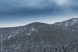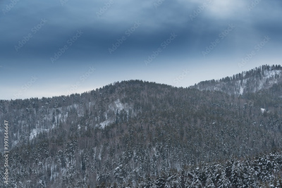 Gentle slopes of forest hills are covered with first snow. View of mountain valleys and ridge on horizon.