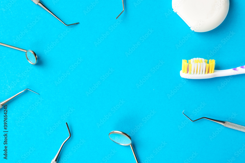 Dental hygiene and health concept. Dentist tools or instruments dental explorers, dental mirrors, dental floss and toothbrush on light blue background. Free space.