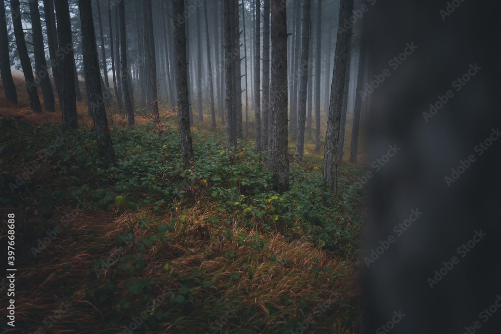 Beautiful landscape of a magical mystical forest, fog in wild forest with tall trees