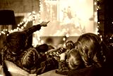family mother father and children watching projector, film, movies with popcorn in christmas evening at home.