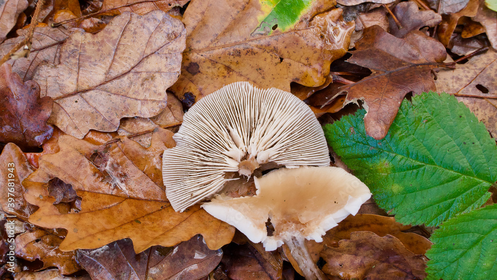 Oyster mushroom surrounded by brown leaves in outdoor setting in autumn