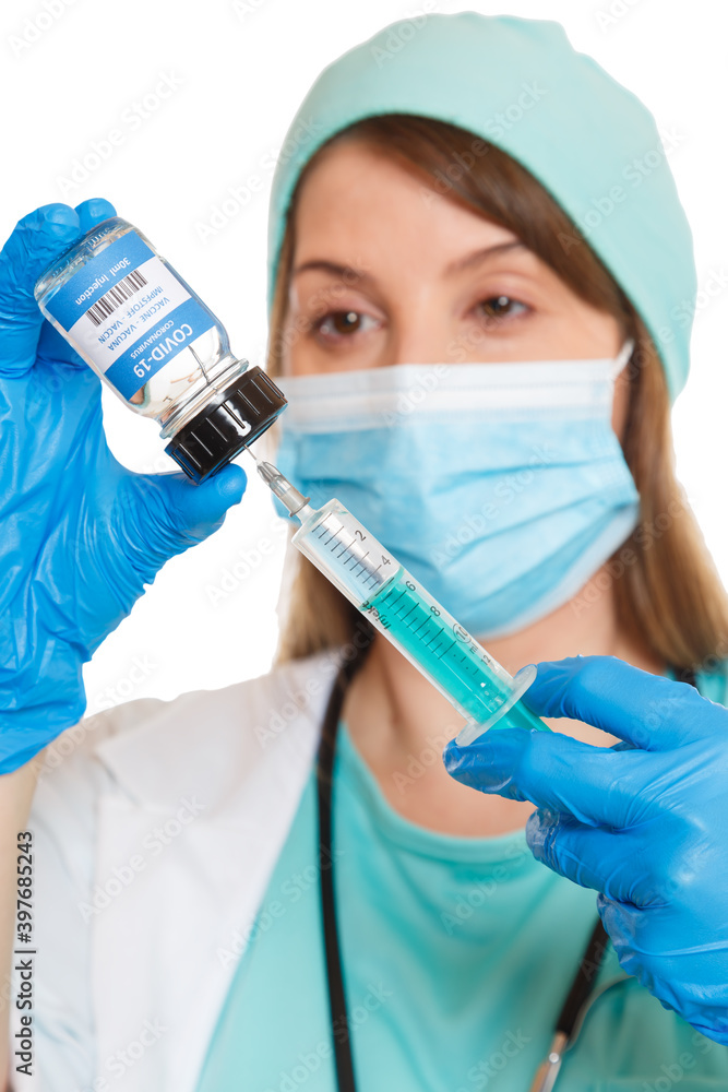 Coronavirus Vaccine bottle Corona Virus syringe doctor COVID-19 Covid vaccines portrait format isolated on white