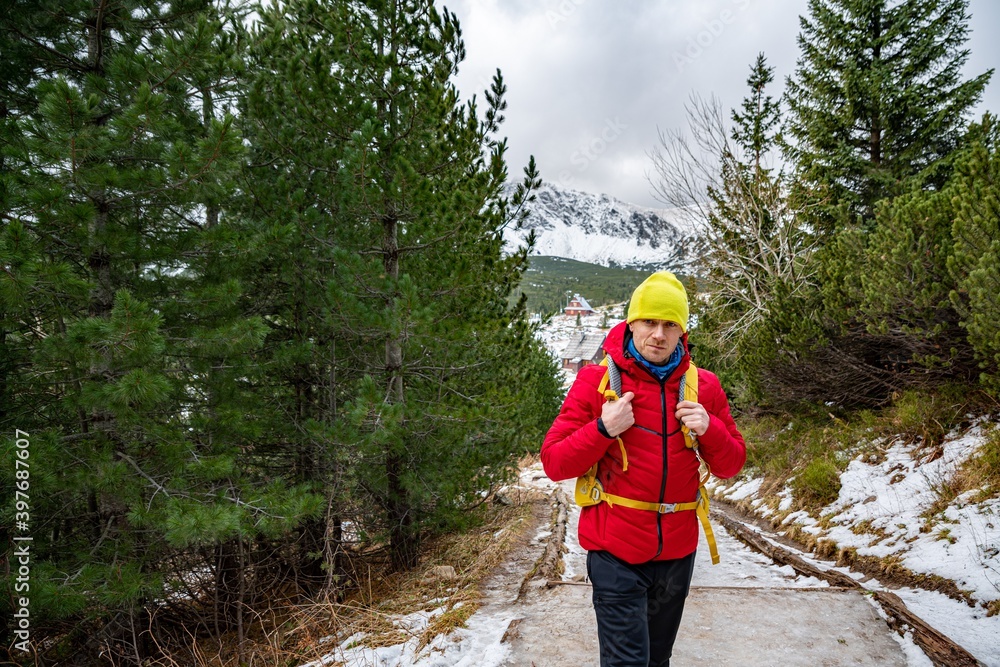 A handsome tourist in a red down jacket, yellow hat and backpack stands on the mountain trail.