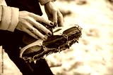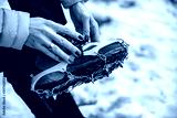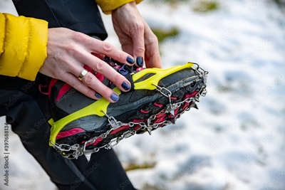 Mountain climber (girl with a manicure) puts on crampon.