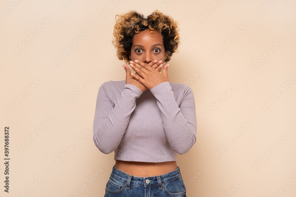 African american woman being shocked covering mouth with hands for mistake.