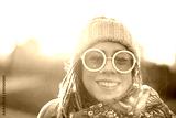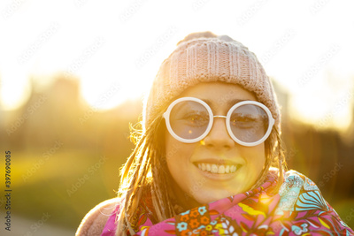 Portrait of young woman wearing knit hat, colorful scarf and sunglasses during winter