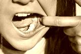 Young woman showing mouth without tooth on lower jaw. Missing tooth. Waiting an implant after tooth extraction