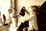 Little toddler girl watering flowers and orchid plants on window at home. Cute child helping, domestic life. Happy healthy kid holding water can, leaning help. Greenery, environment concept.