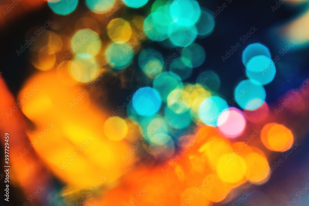 Colorful background with natural bokeh texture and defocused sparkling lights. Teal and orange blur with background with twinkling lights. Festive lights overlay colors with copy space