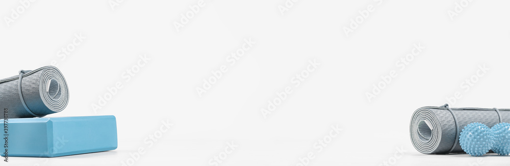 Rolled blue yoga mat and foam block or brick, massage double ball. Gender neutral fitness and exercise concept accessories with copy space. Active lifestyle. Workout at home or gym, sports club banner