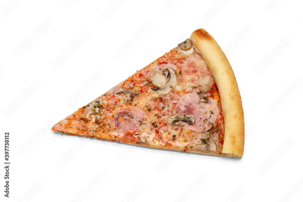 A slice of meat pizza with mushrooms. Concept for flyer, poster, menu for pizzeria, isolated.