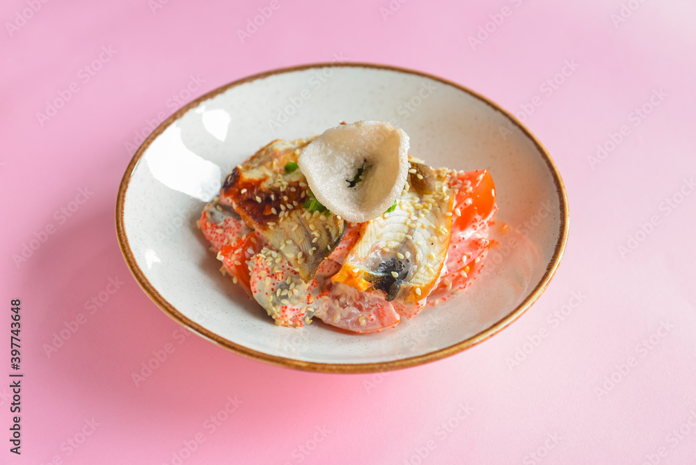 Sea food salad with smoked salmon, tomatoes, pepper and sesame seeds. Restaurant food.