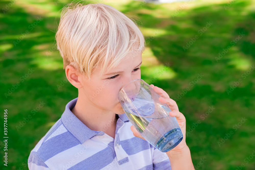 Young caucasian boy drinking clear fresh mineral water, outdoors during summer time. Health concept.