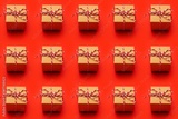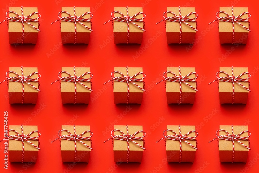 Christmas gift on a colored red background. New Year, holiday, give, pack pattern
