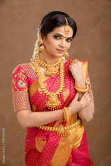 Beautiful Indian young Hindu Bride against brown background in studio shot