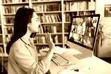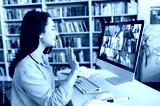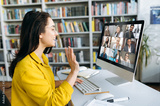 Online education. A female student learning online at home, she waving hand to other students or colleagues on computer monitor in video conference and smiling