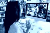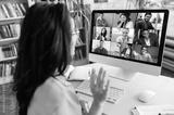 Computer monitor view over female shoulder during group video call with multi-ethnic international business colleagues discussing about future financial plans and strategy