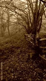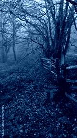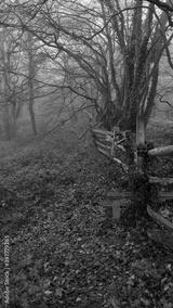 Portrait image of woods on misty winters day with brown foliage on ground