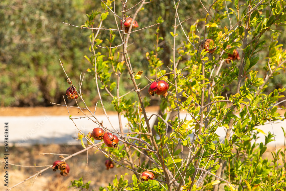 Ripe pomegranate fruits hanging on a tree branches in the garden.