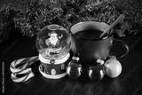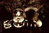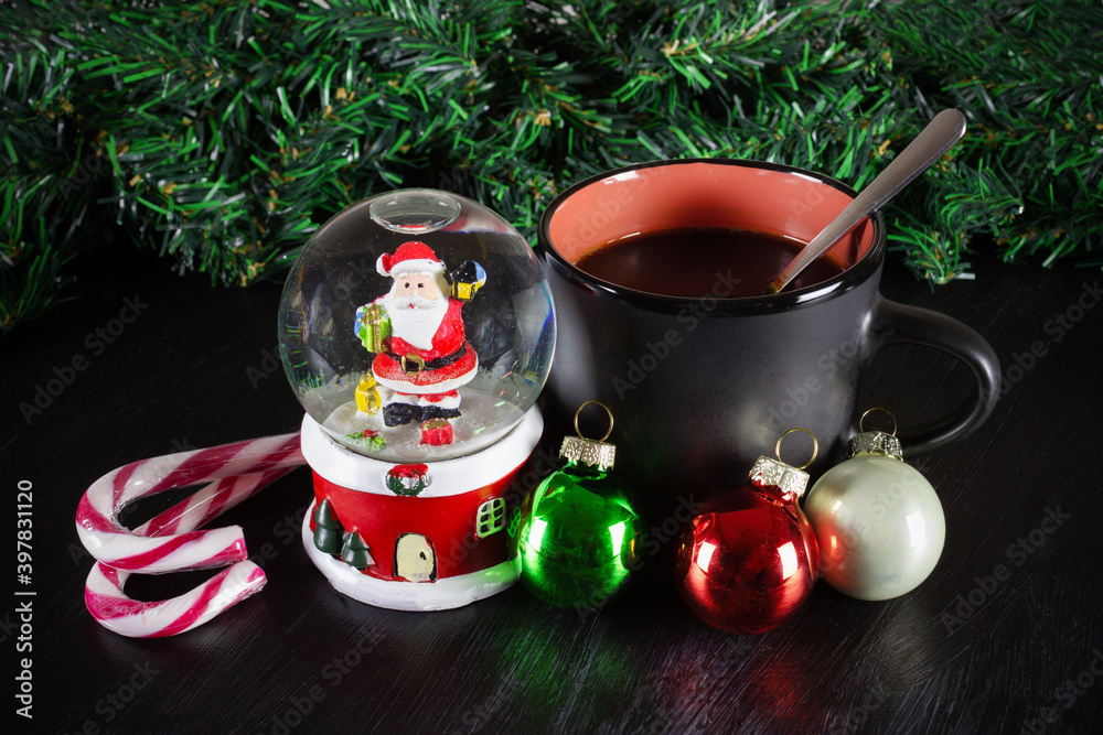 Santa Claus toy in glass ball, red, green, white Christmas balls, two candy canes and dark mug with coffee on background of fir branches.