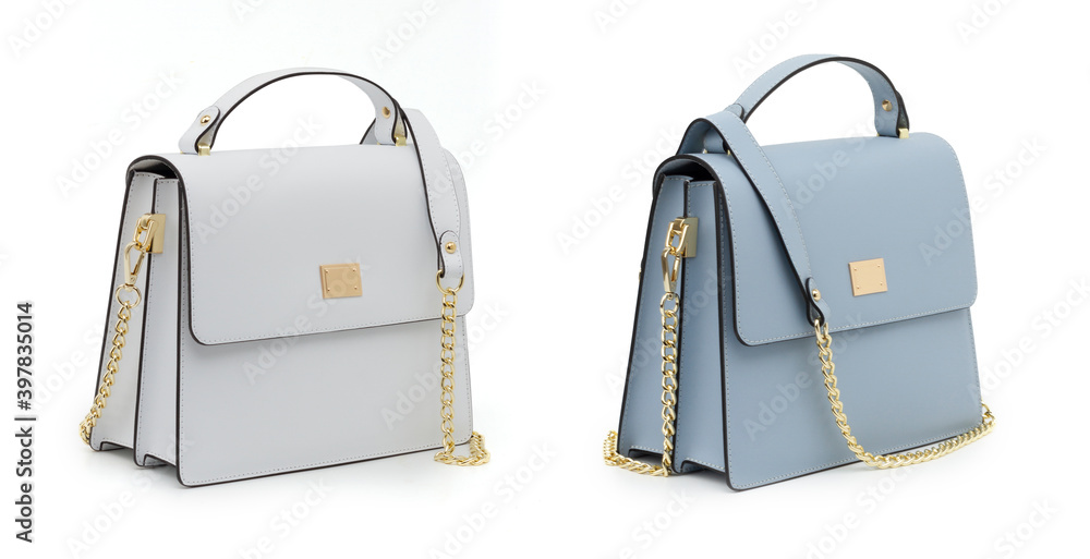 group of two colored women handbags isolated on white background