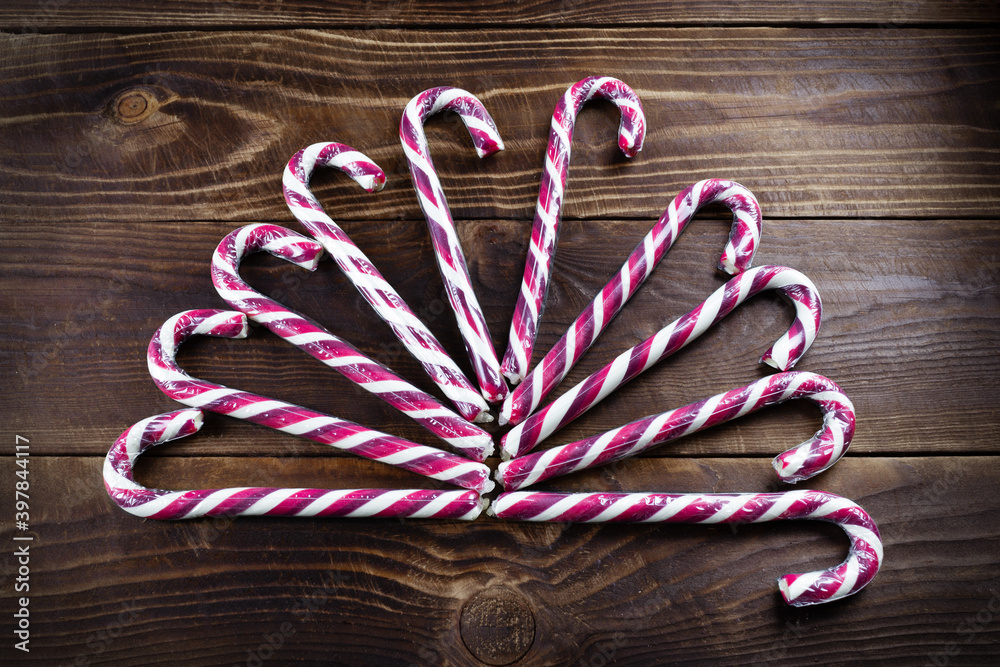 Several red and white Candy Cane spread out like fan on brown wooden surface with boards