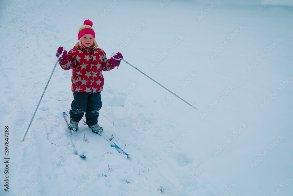 little girl ski in winter nature, kids active lifestyle, winter sport