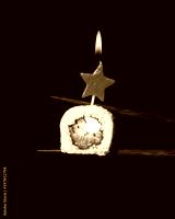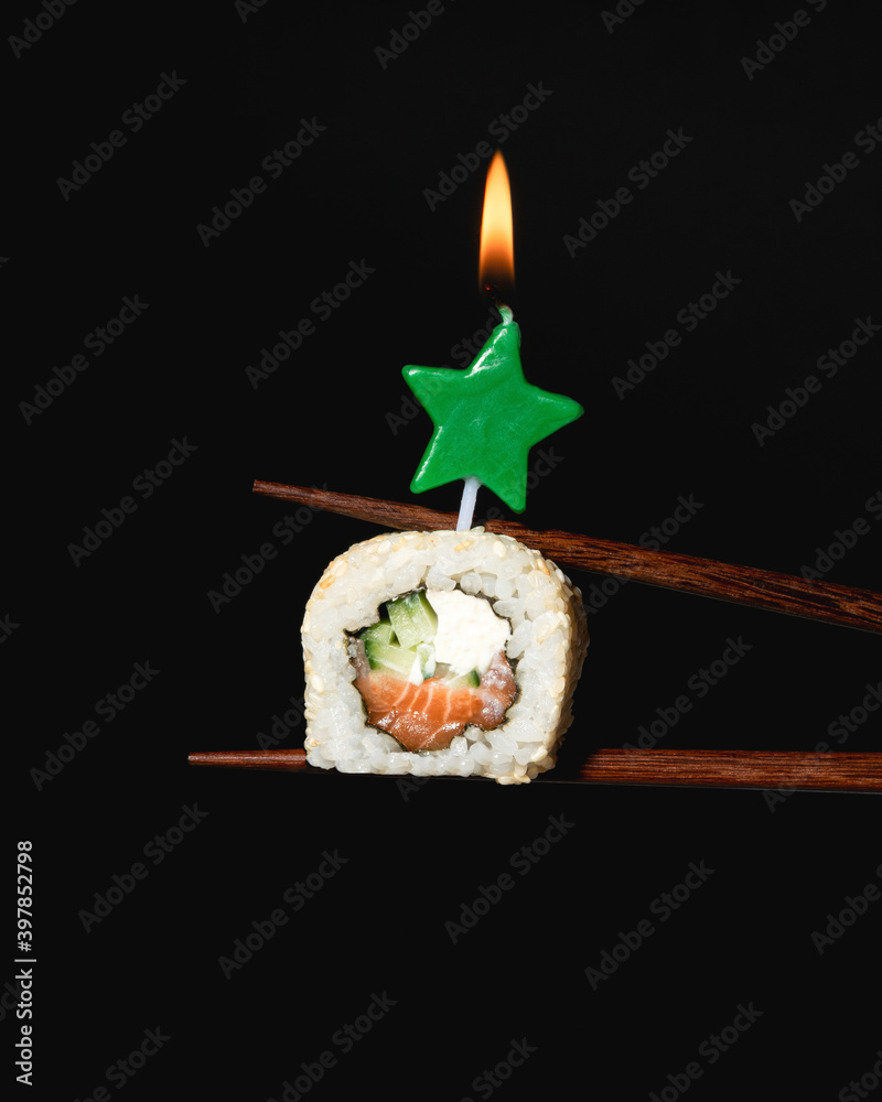 Sushi on black background. Philadelphia maki roll piece between chopsticks with green star shaped burning candle. Christmas and New Year celebration party. Creative japanese food. Faded, close up