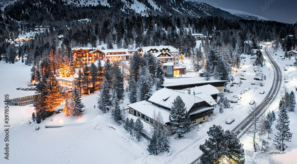 View on the mountains with hotels in Turracher Höhe, Austria in winter