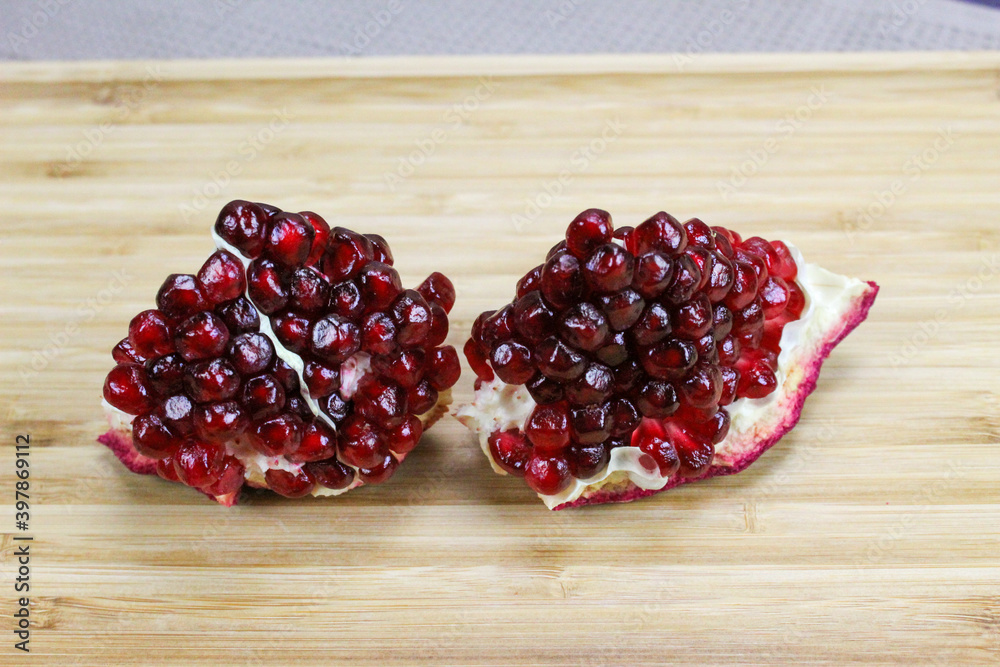 Two pieces of pomegranate with red seeds on a wooden tray. Pomegranate seeds. One piece next to another piece of ripe pomegranate fruit.