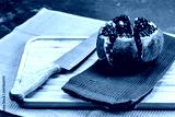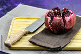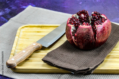 An open pomegranate fruit that is divided into five parts that are held together on a napkin / cloth on a wooden tray on a blue background. Large red ripe pomegranate with a knife next to it.