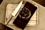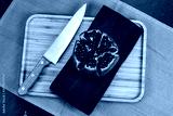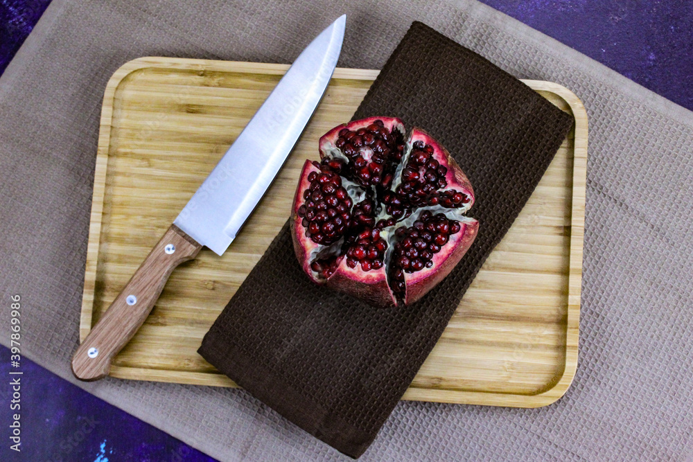 An open pomegranate fruit that is divided into five parts that are held together on a napkin / cloth on a wooden tray on a blue background. Large red ripe pomegranate with a knife next to it.