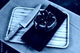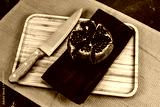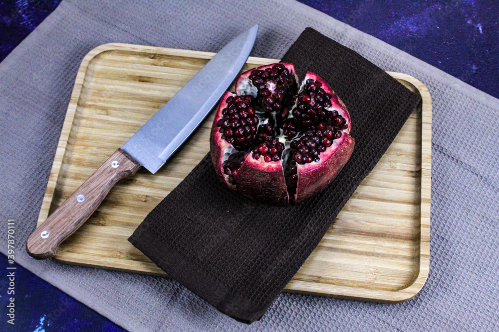 An open pomegranate fruit that is divided into five parts that are held together on a napkin / cloth on a wooden tray on a blue background. Large red ripe pomegranate with a knife next to it.