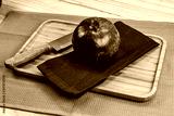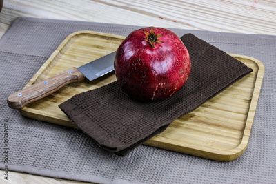 Whole pomegranate fruit on a napkin / cloth on a wooden tray on the table. A large red ripe pomegranate with a knife next to it, ready to be opened. The concept of healthy living. Fruit pomegranate.
