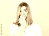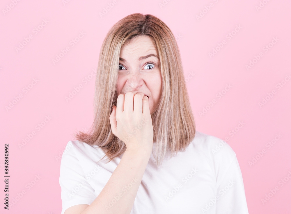 Close up portrait of a worried teenage girl in white t-shirt biting her nails isolated over pink background