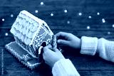 Kid making Christmas gingerbread house at home. Preparation for holiday dinner. Child decorating handmade sweet gift. Close up of children hands. Copy space.