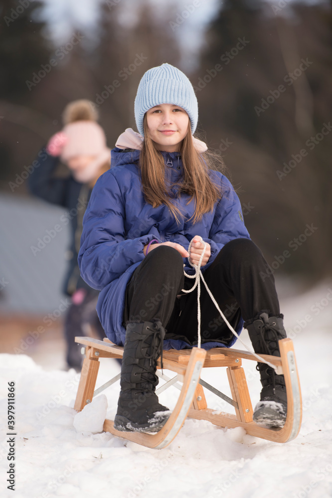 Young girl on sleigh