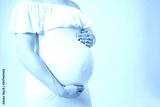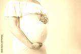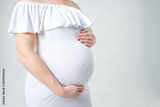 Motherhood, pregnancy, expecting a baby, family concept. A pregnant woman in a beautiful white tight-fitting dress gently holds her hands on her stomach. Close-up. Side view. Studio white background.