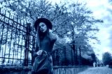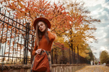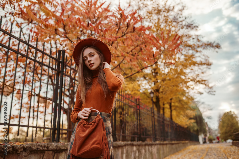 Young elegant, fashionable woman wearing stylish orange hat, turtleneck, holding suede handbag with fringe, posing in street. Outdoor autumn fashion portrait. Copy, empty space for text