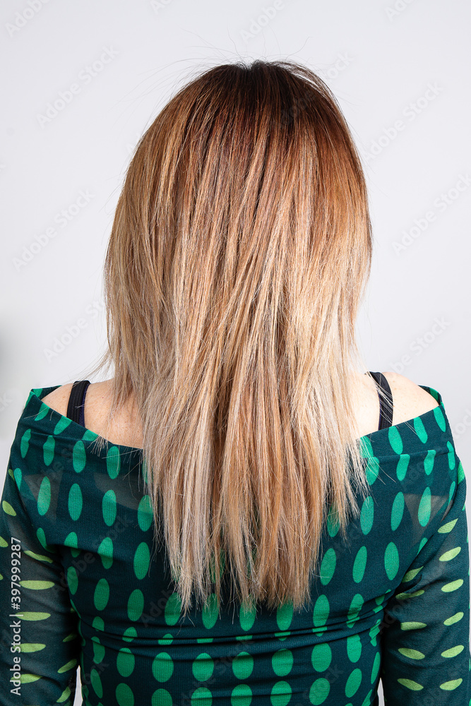 Back view of the young female with beautiful blond straight long hairs wearing sweater