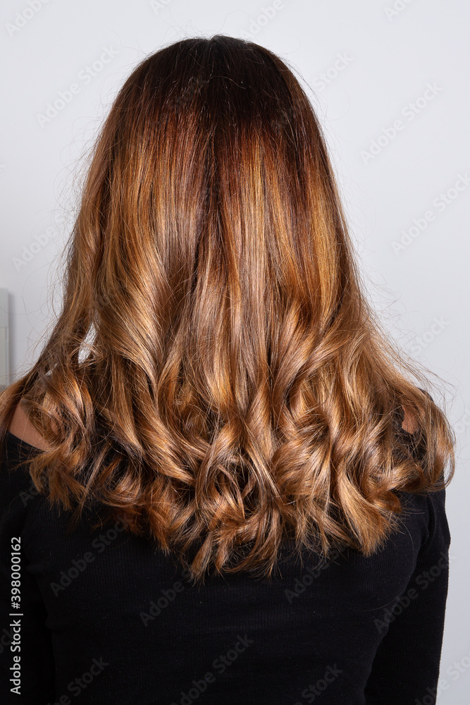 Half body portrait of rear view of a woman with long brown curly hair wear clothes