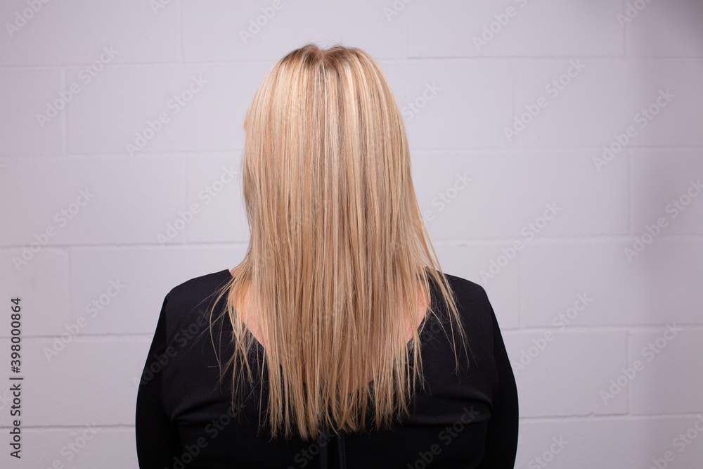 Back view of the young female with beautiful blond straight long hairs wearing black sweater