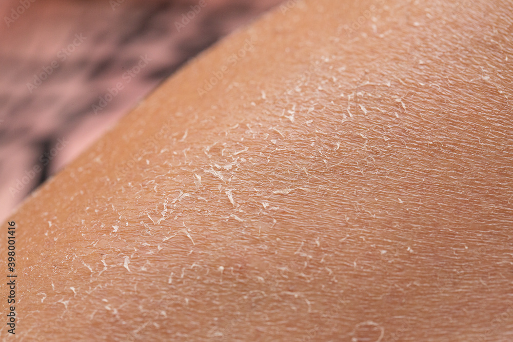 Texture of unhealthy epidermis of human skin ugly flakes and cracked particles closeup