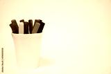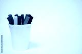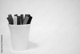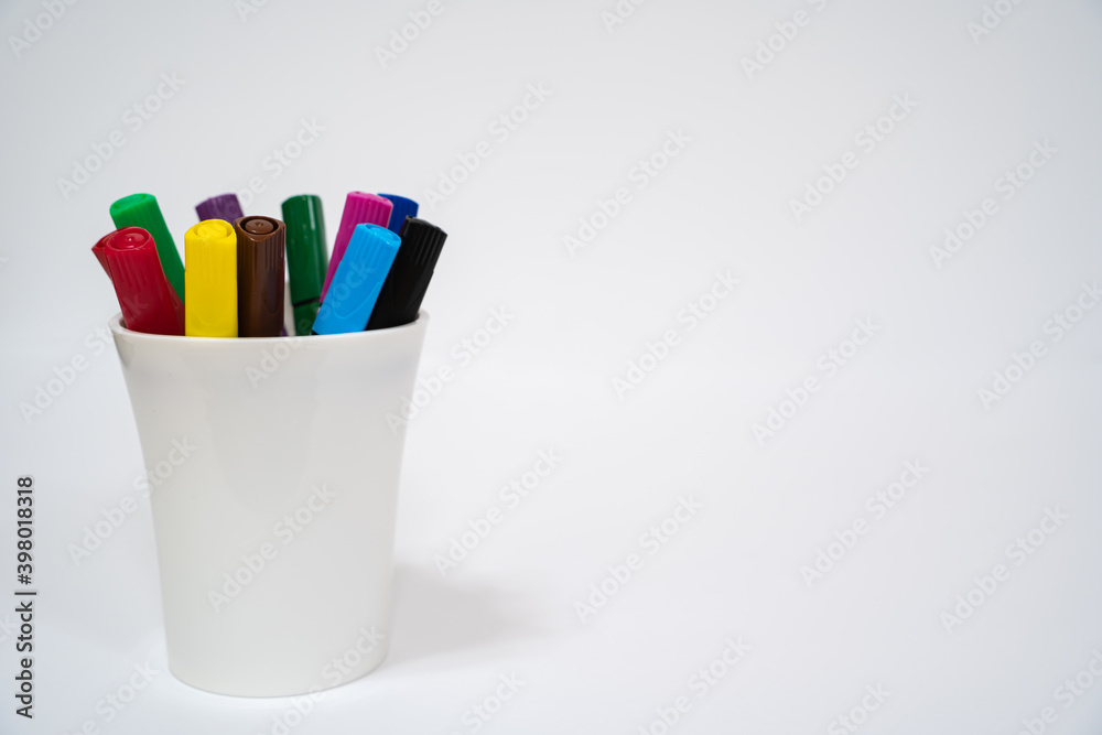 Set of multicolored markers in a white cup on a white background. Close-up. Copy space.