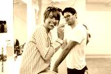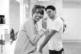 Laughing couple brushing their teeth together