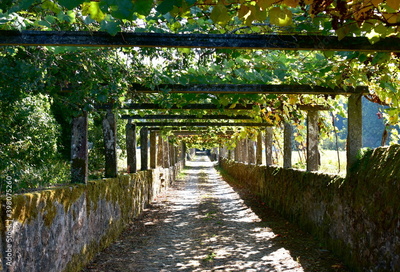 Footpath with vine tree at famous Albariño wine region. Cambados, Rias Baixas, Pontevedra, Galicia, Spain.