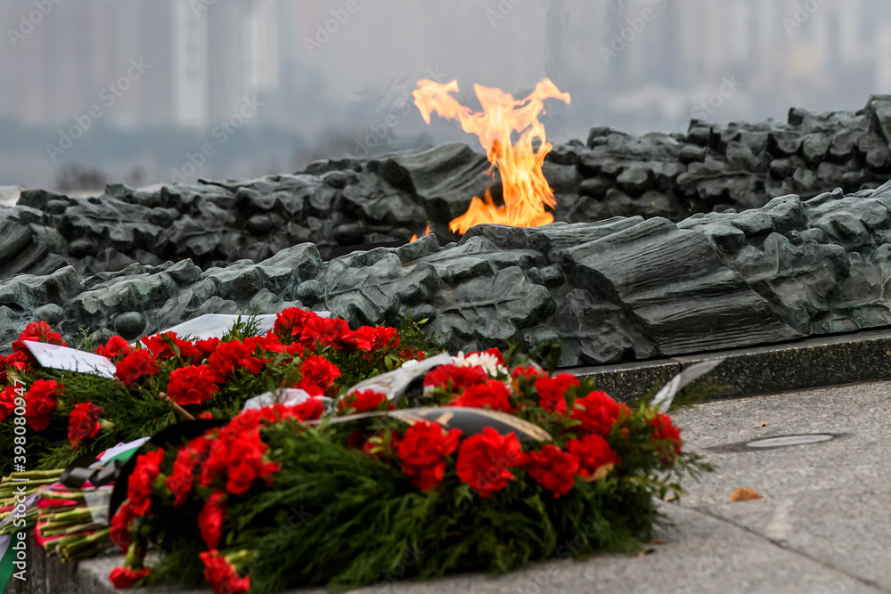 Eternal flame near the Monument Tomb of the Unknown Soldier in Kyiv, Ukraine. November 2020