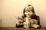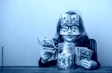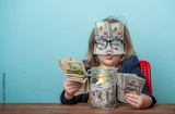 Education for kids how to be rich. Child with dollar bills shoved over glasses covering eyes. Financial independence and ability to earn a lot of money. Back to school