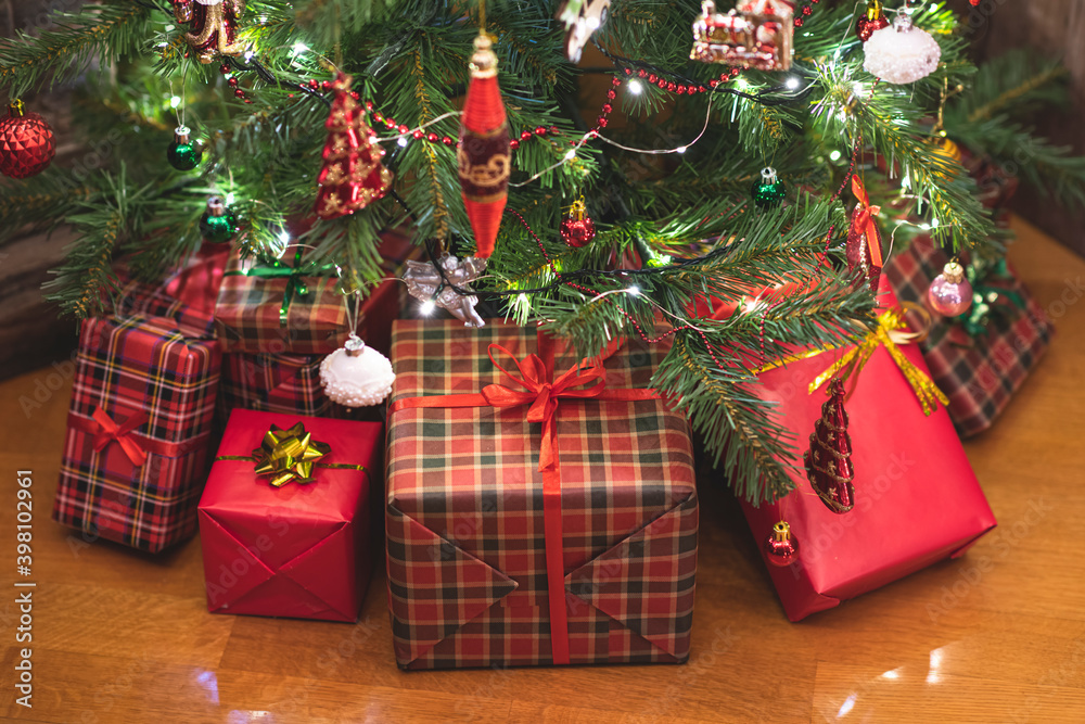 A lot of gift boxes under christmas tree. Presents for family.