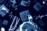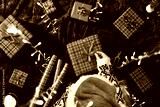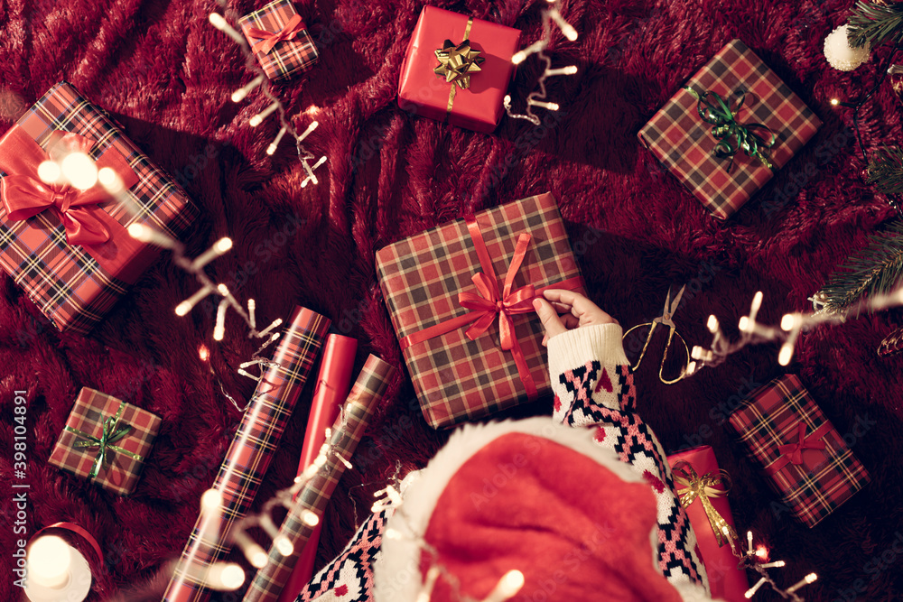 Top view of woman in red santa claus hat wrapping christmas gifts boxes for family sitting on fluffy plaid near christmas tree. Flat lay.